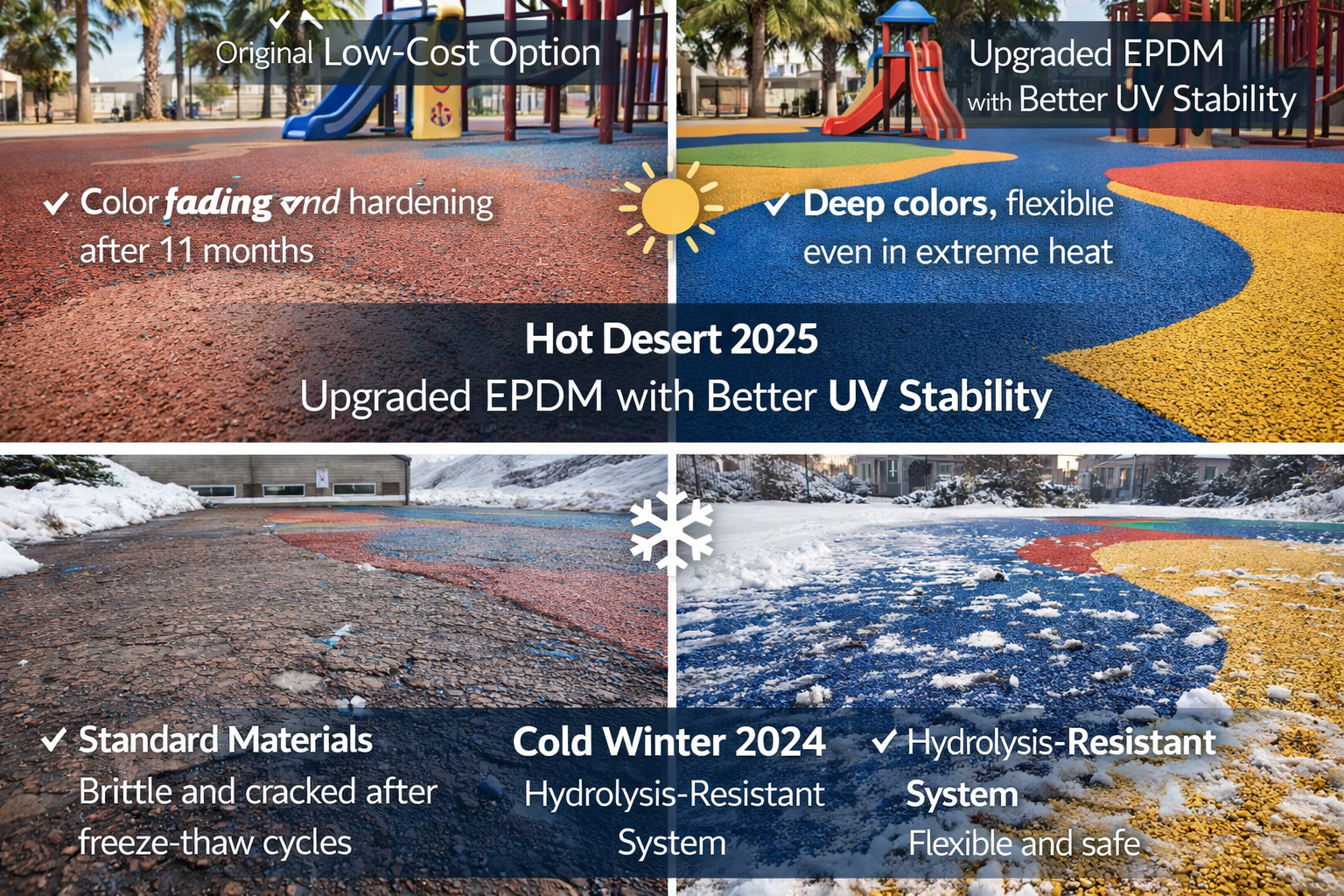 In 2025, we helped a large international school in a hot desert climate select materials for a new playground. The original low-cost option started showing color fading and surface hardening after just 11 months. After switching to higher-purity EPDM with better UV stabilization, the second installation has performed excellently even under extreme heat.