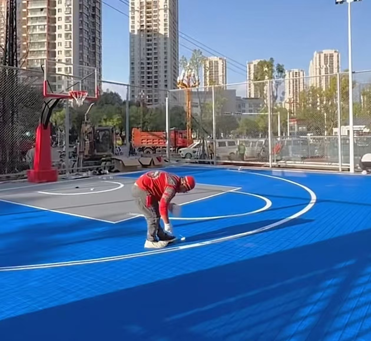 The fifth step, the site marking, according to the requirements, use the beautiful paper to draw the corresponding lines on the ground, marking to ensure that the width and length of the line meet the standard.