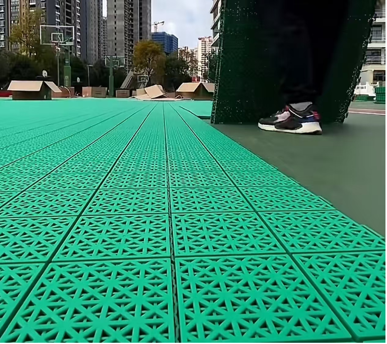 In the late 1980s, in order to solve the problem that traditional sports flooring (such as wood floor and plastic flooring) is susceptible to weather when used outdoors. This new floor is made of polypropylene (PP) material, which has the advantages of durability, strong weather resistance, anti-skid, easy cleaning and maintenance.