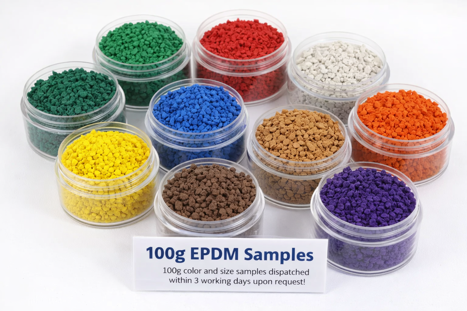 Our EPDM granules are optimized for use with aliphatic (non-yellowing) polyurethane (PU) binders at a typical ratio of 18-22% by weight. We also supply compatible EPDM granule PU glue — ask for a bundled quote.